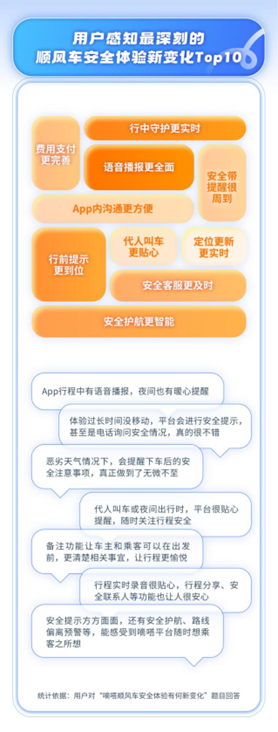 “用户感知最深刻的顺风车安全体验新变化Top10”中,语音播报更全面、行中守护更实时、行前提示更到位、安全护航更智能、安全客服更及时等,成用户提及最多的前五大高频词;