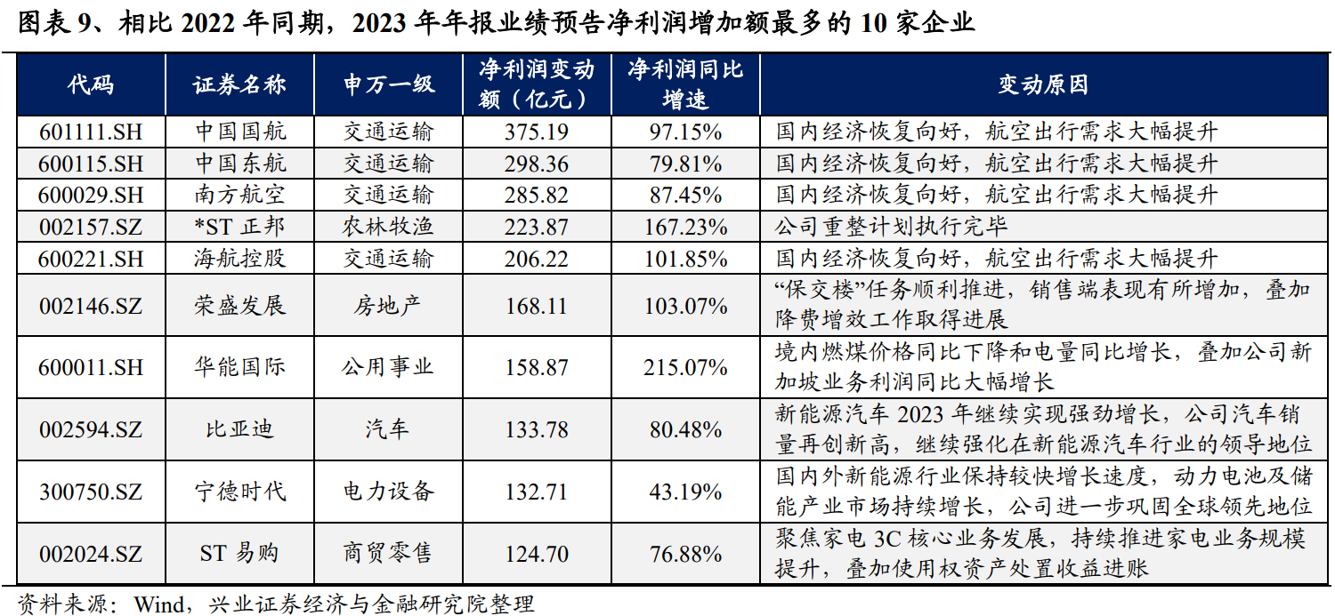 三、个股情况:四大航净利润预增规模居前,新能源上游和房地产预亏较多