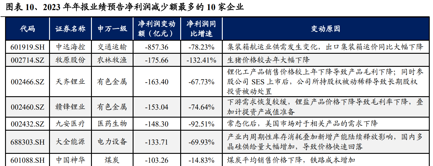 从个股来看,2023年年报业绩预告净利润增加额最多的10家公司中4家分布于交通运输行业,主要受益于国内经济复苏、消费者出行能力和意愿修复;另外还有2家来自新能源板块,其余则平均分布在农林牧渔、地产、公用事业和商贸零售行业。而2023年年报业绩预告净利润减少额最多的10家公司中有4家分布于新能源上游板块(锂矿&硅料),主要是受产能过剩,供需失衡,主要产品价格下跌影响;还有2家来自房地产板块,地产基本面仍然相对承压。