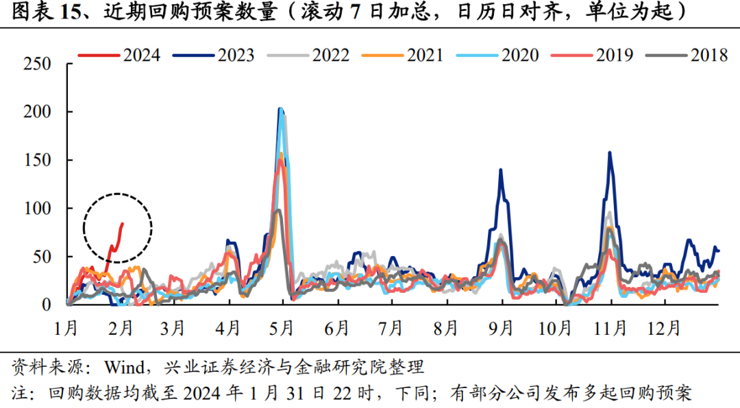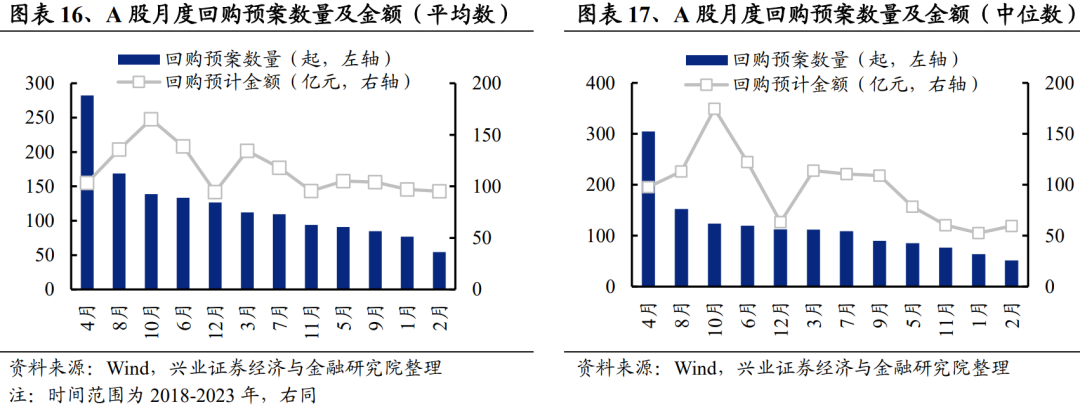 2024年上市公司回购有明显的超季节性特征。从2018-2023年的数据来看,A股市场股票回购具有明显的月度效应。4月和8月通常是上市公司回购的高发期,原因在于上市公司年报和半年报陆续发布,业绩状况得到确认。不管是从平均数,还是中位数角度,2018年-2023年期间,1月和2月回购预案发起数量在所有月份中排名倒数前二。而2024年回购预案的发起则呈现明显的超季节性。
