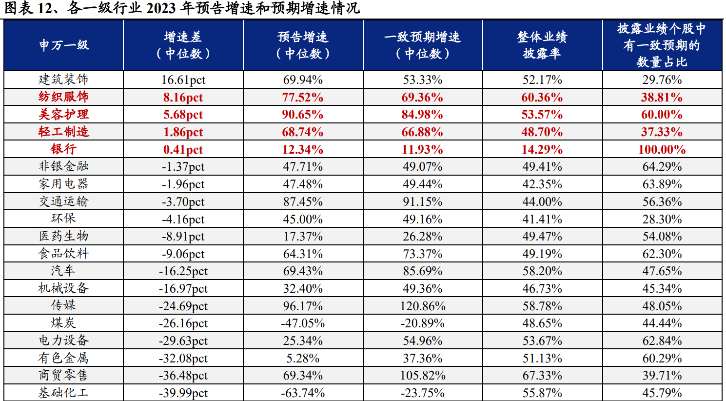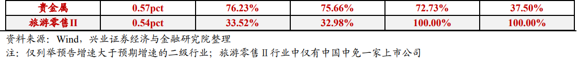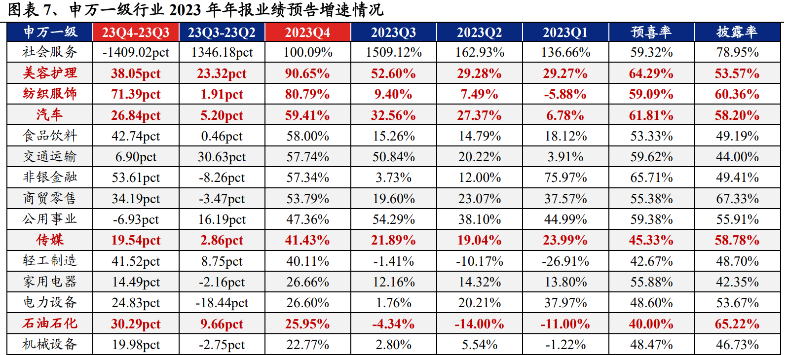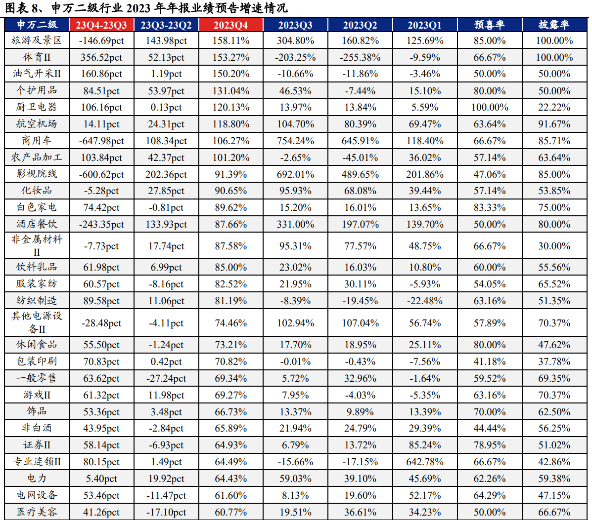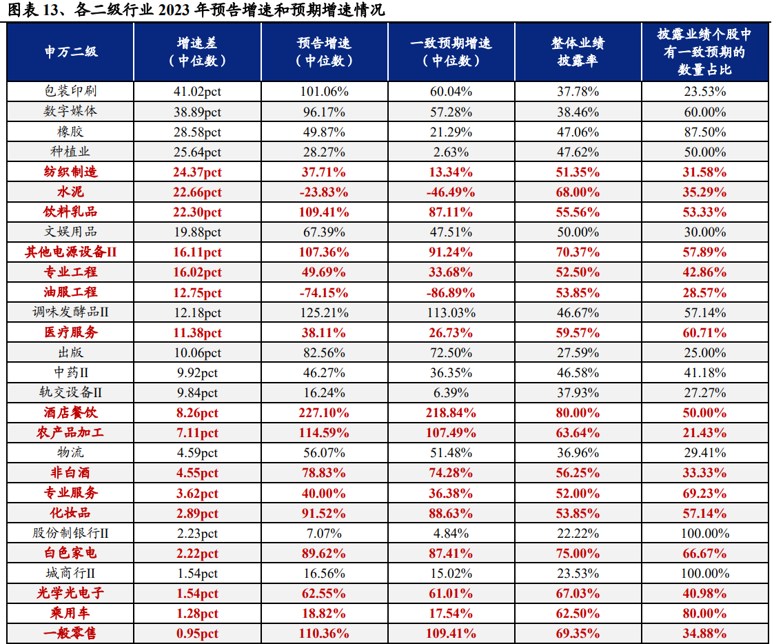 从23年报业绩预告同比增速来看,30个申万一级行业中(剔除综合行业,下同)共有21个行业实现业绩同比增长,其中社会服务(100.09%)、美容护理(90.65%)、纺织服饰(80.79%)、汽车(59.41%)和食品饮料(58.00%)等行业增速居前;旅游及景区、体育、油气开采、个护用品、航空机场、商用车、农产品加工、影视院线、化妆品和白色家电等细分行业净利润增速居前且实际披露率不低于50%。