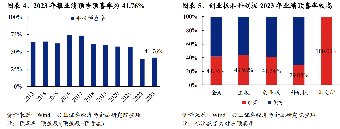 已披露业绩预告的公司中,预喜率为41.76%。我们按照业绩预告的类型,将已披露业绩预告公司分为预盈(包含略增、扭亏、续盈、预增)、预亏(略减、首亏、续亏、预减)两组,预喜率为预盈公司数量的占比。在已披露业绩预告类型的上市公司中,共1102家预盈、1537家预亏[1];预喜率为41.76%,较2022年报业绩预告有所回升;其中主板、创业板、科创板和北交所的预喜率分别为43.98%、41.24%、29.08%和100.00%。