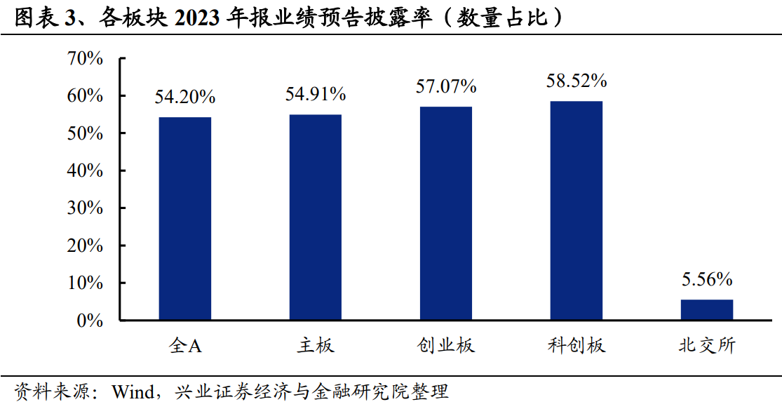 根据交易所最新关于业绩预告的披露规则,目前上市公司有条件披露年度业绩预告。截至2024年1月31日10时,A股整体5022家上市公司中(剔除上市一年之内的公司,下同),共2728家上市公司发布了2023年报业绩预告/快报/年报,其中实际公布业绩2722家,实际披露率为54.20%。其中主板3138家上市公司有1723家披露,披露率(数量占比)为54.91%;创业板1223家上市公司有698家披露完毕,披露率57.07%;科创板499家公司有292家披露,披露率为58.52%;北交所162家公司仅9家披露,披露率为5.56%。