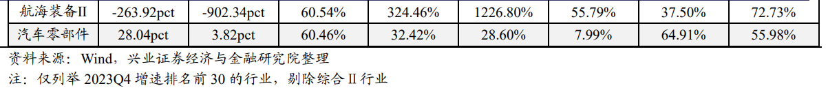 从23Q4相比23Q3业绩增速变化情况来看,20个行业实现业绩增速改善,其中农林牧渔(304.53pct)、纺织服饰(71.39pct)、非银金融(53.61pct)、钢铁(50.22pct)和建筑材料(44.16pct)等行业改善幅度居前;体育Ⅱ、油气开采、林业、农产品加工、光学光电子、纺织制造、个护用品、白色家电、一般零售、饮料乳品等细分行业改善幅度居前且实际披露率不低于50%。