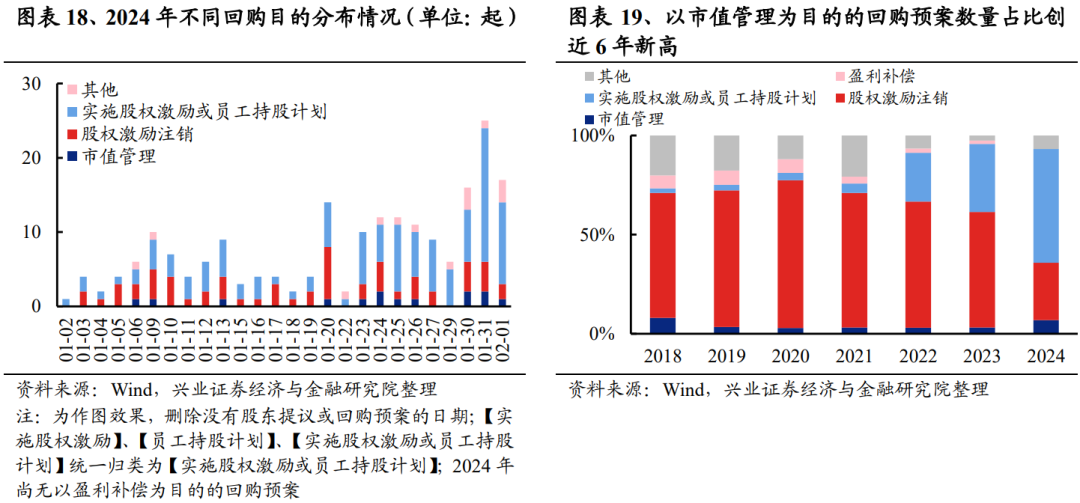 从回购目的来看,其一,市场弱势震荡,公司通过回购向市场传递积极信号,以期提振股价;其二,2024年以股权激励方案/员工持股计划为目的的公司回购或成为市场主流,指向公司对未来业绩改善有信心;其三,近期国资委两提“市值管理考核”,回购或将成为央企国企管理市值的重要举措。2024年以来,以市值管理为目的的回购预案数量占全部预案数量的比重大幅提升至6.86%,超过2023年一倍有余(2023年占比为3.16%),是近6年来的新高。