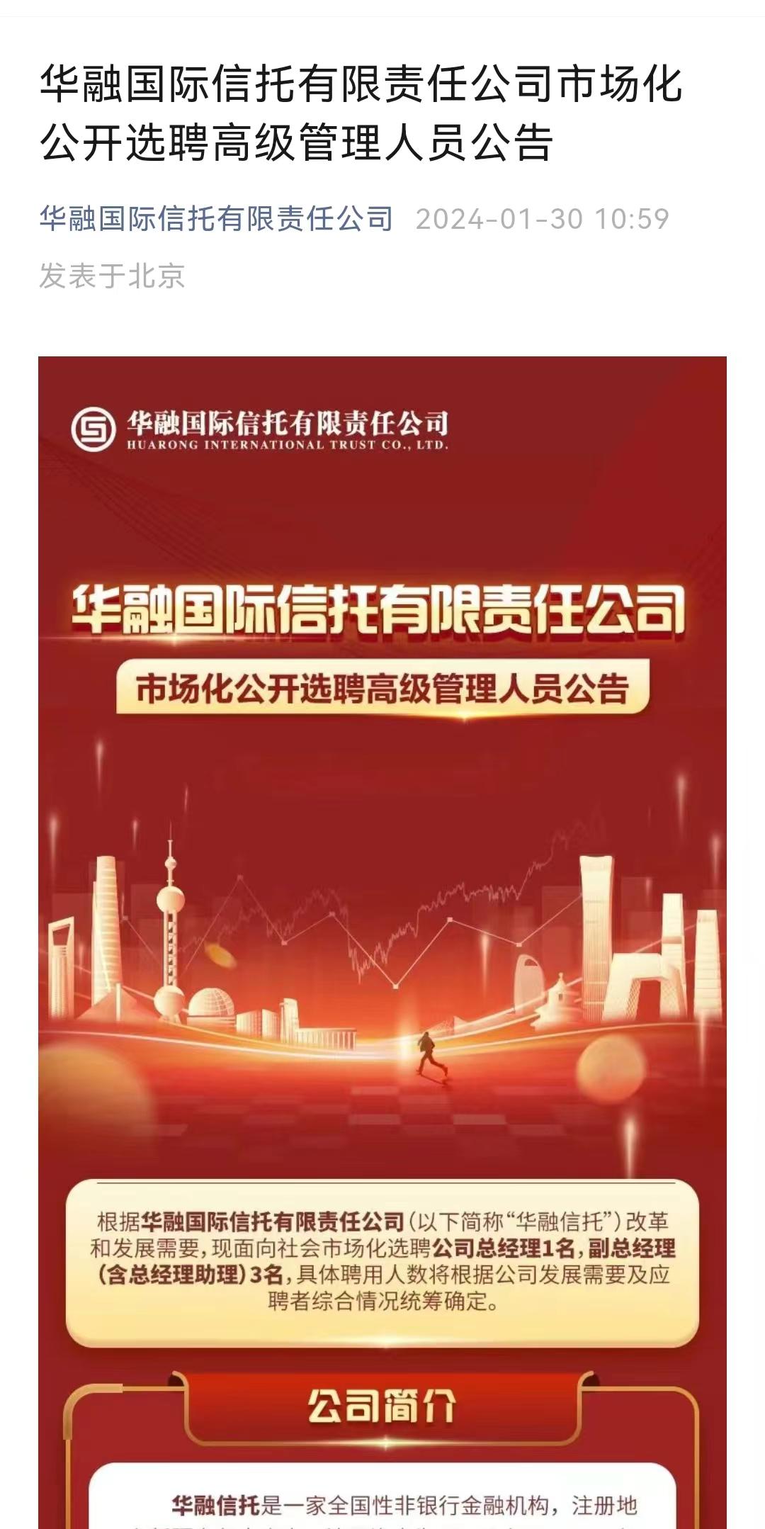 本次华融信托招募“一正三副”总经理,要求应聘者需满足10年以上信托公司或银行、证券等金融机构工作经验。