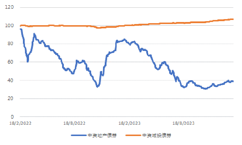 图2. 中资房地产、城投板块美元债指数走势(基准=100)