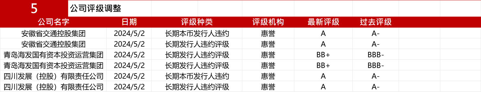 二级市场方面,中资美元债投资级市场整体小幅收窄。国企板块,中石油、中海油收窄3-5bps;科技板块,高贝塔名字如美团、微博收窄3bps左右;金融板块,AMC整体持稳;投资级地产板块,龙湖、万科小幅下跌0.5pt;高收益地产板块走势分化,雅居乐、绿城中国上涨0.25-0.5pt,新城、瑞安下跌0.2-0.5pt。