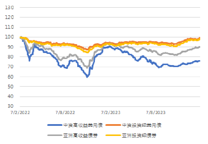 图1. 中资及亚洲美元债指数走势(基准=100)