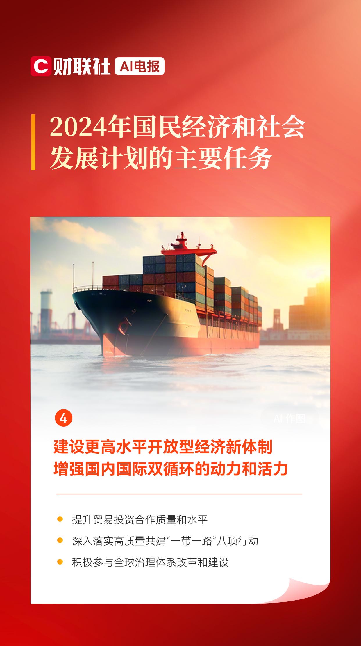 【国家发改委:建设更高水平开放型经济新体制】财联社3月5日电,国家发改委3月5日发布《2024年国民经济和社会发展计划的主要任务》。其中提出,建设更高水平开放型经济新体制,增强国内国际双循环的动力和活力。