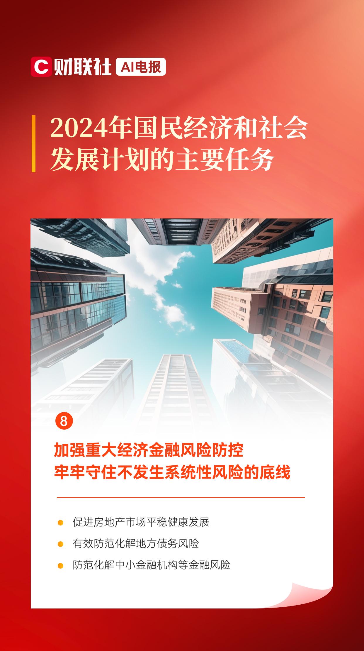 【国家发改委:加强重大经济金融风险防控 牢牢守住不发生系统性风险的底线】财联社3月5日电,国家发改委3月5日发布《2024年国民经济和社会发展计划的主要任务》。其中提出,加强重大经济金融风险防控,牢牢守住不发生系统性风险的底线。