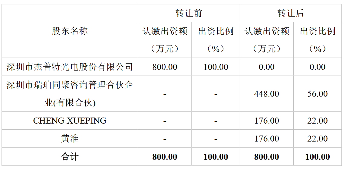 3月6日,杰普特发布公告,该公司基于战略规划需要,拟向深圳市瑞珀同聚咨询管理合伙企业(下称“瑞珀同聚”)、CHENGXUEPING、黄淮转让公司控股子公司深圳市瑞珀精工有限责任公司(下称“瑞珀精工”)100%的股权,本次交易完成后,该公司不再持有瑞珀精工股权。