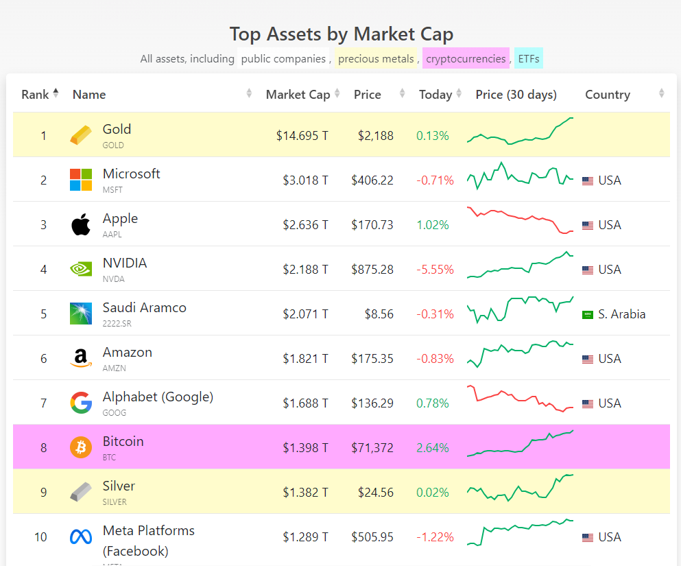 据 CompaniesMarketCap数据,全球市值前九资产依次是:黄金、微软、苹果、英伟达、沙特阿美、亚马逊、谷歌、比特币、白银