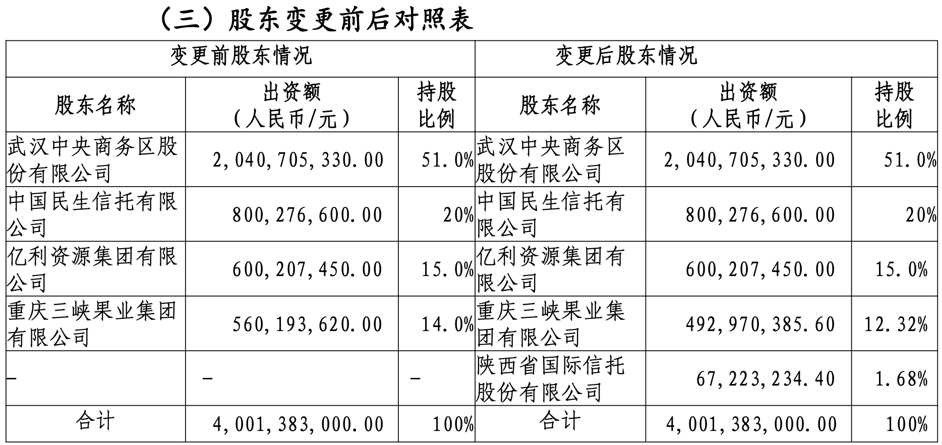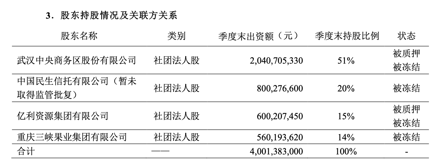 据悉,股权转划完成后,重庆三峡果业仍持有亚太财险12.32%股权,位居第四大股东之位。截至目前,除了陕国投信托、重庆三峡果业之外,亚太财险还有3位股东,即武汉中央商务区、民生信托(暂未取得监管批复)和亿利资源集团,分别持股51%、20%、15%。