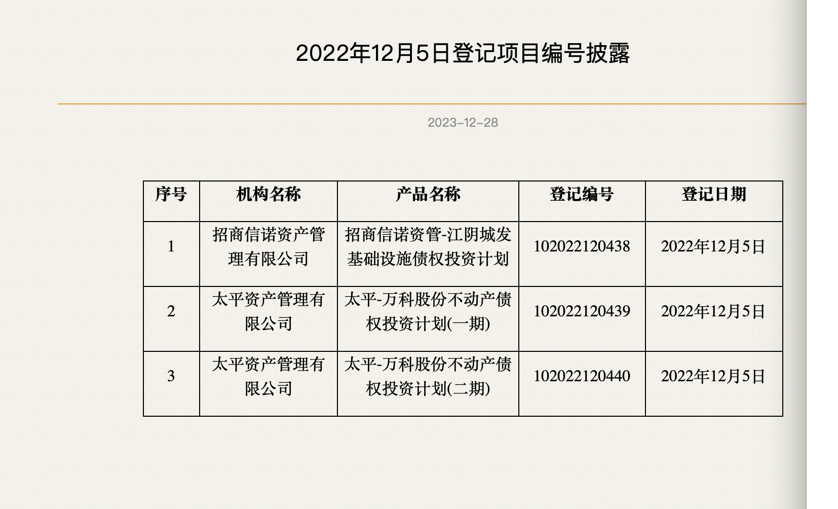 【万科郁亮带队与公司商谈?接近太平保险人士:债务未到期 没到访过公司】财联社3月12日电,在万科陷入债务展期风波后,市场屡次传出万科董事局主席郁亮与深圳地铁相关高层赴北京与多家险资商谈债务展期事宜,险资机构中包括太平保险。对此,多位接近太平保险的知情人士向蓝鲸记者表示,“太平保险仅有两笔与万科相关的债权投资计划,即太平-万科股份不动产债权投资计划(一期)、太平-万科股份不动产债权投资计划(二期),但该债权投资计划均于2025年到期,所以不存在商谈展期这件事,他们也没来找过我们。”(蓝鲸记者 陈业)