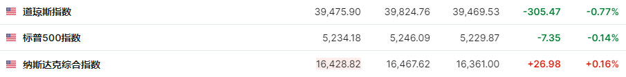 截至收盘,道琼斯指数跌0.77%,报39,475.90点;标普500指数跌0.14%,报5,234.18点,双双结束四连涨;纳斯达克综合指数涨0.16%,报16,428.82点,收盘价刷新历史新高,且录得日线五连涨。