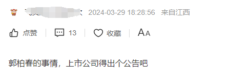 郭柏春落网的消息在股吧也引起了股民的热烈讨论,有股民发帖称“为什么还没有公告?”,也有股民表示“郭柏春的事情,上市公司得出个公告吧”。