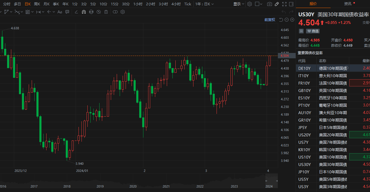 【6月降息概率降至五成以下 美国5年、10年和30年期国债收益率触及年内高点】财联社4月2日电,美国5年、10年和30年期国债收益率触及年内高点。就在刚刚,美国30年期国债收益率升至4.5%上方,创去年12月1日以来的新高。美国30年期国债收益率升至4.5%上方,创去年12月1日以来的新高。美国5年期国债收益率升至4.375%上方,创去年11月28日以来的新高。在美国一项制造业指标自2022年以来首次升至扩张区间后,债券交易员下调了对今年货币宽松的预期,一度预计6月份启动降息的概率不足50%。因ISM制造业指数超过所有经济学家预期,市场预计联储会年内降息幅度不足65基点,低于联储会官员自身的预期。