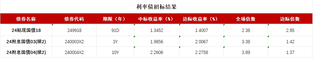 【财政部三期国债已招标结束 10年期品种加权中标收益率为2.2606%】财联社4月3日电,从银行间市场获悉,财政部三期国债已招标结束,其中:91天期国债“24贴现国债18”加权中标收益率为1.3452%,边际中标收益率为1.4007%,全场倍数2.38,边际倍数1.85;3年期国债“24附息国债03(续2)”加权中标收益率为1.9856%,边际中标收益率为2.0067%,全场倍数3.38,边际倍数1.42。10年期国债“24附息国债04(续2)”加权中标收益率为2.2606%,边际中标收益率为2.2758%,全场倍数3.89,边际倍数1.37。