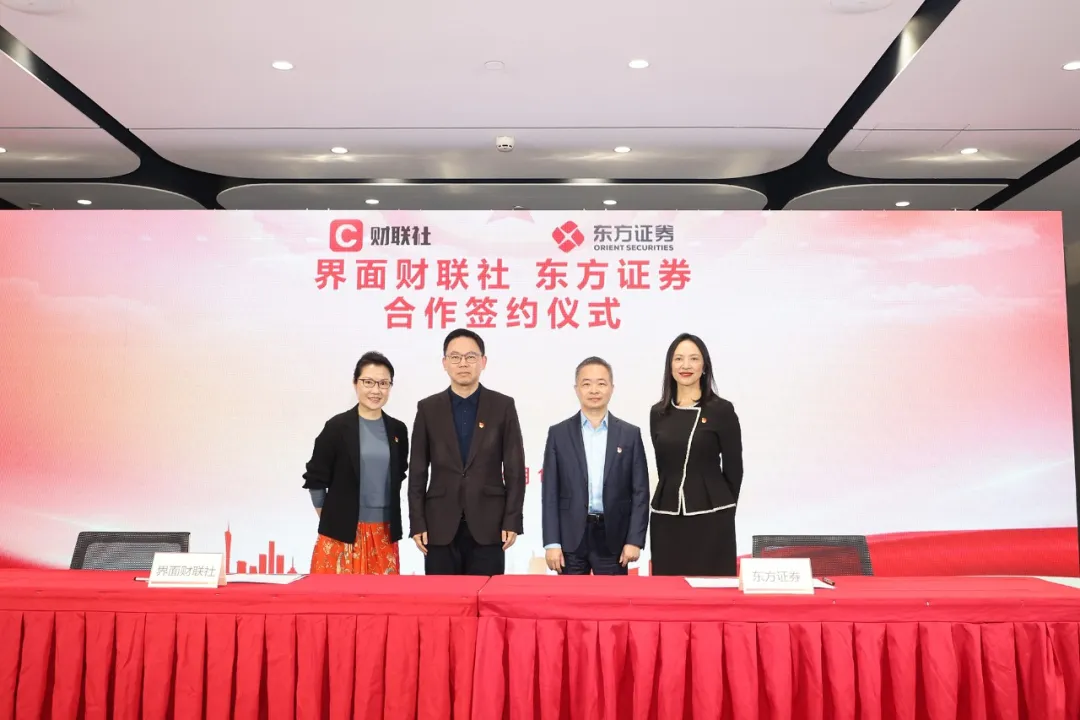 在上报集团领导丁波、东方证券领导鲁伟铭见证下,界面财联社董事长章茜与东方证券副总裁徐海宁签署合作协议。