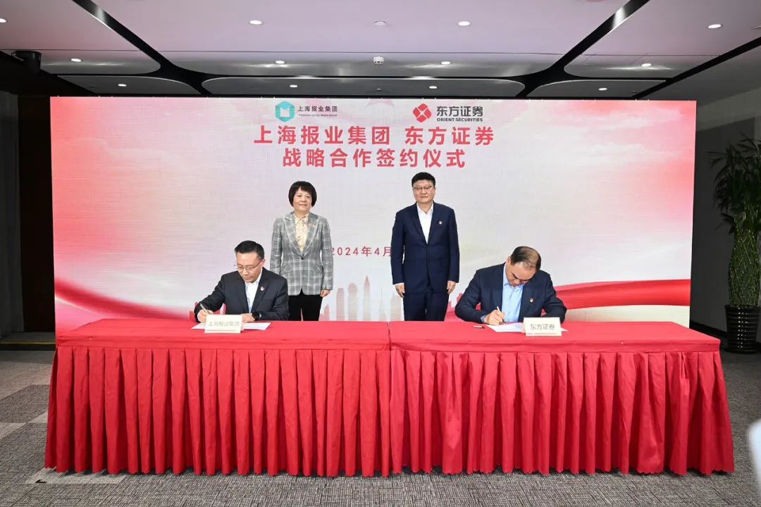 为进一步促进新闻媒体与证券行业围绕主责主业互相赋能发展,共同助力“文化+金融”融合,培育媒体、金融领域的新质生产力,今天(4月10日),上海报业集团与东方证券签署战略合作协议。上报集团党委书记、社长李芸,东方证券党委书记龚德雄见证签约,上报集团党委副书记、总经理、副社长胡明华,东方证券党委副书记、董事长金文忠代表双方签署战略合作协议。