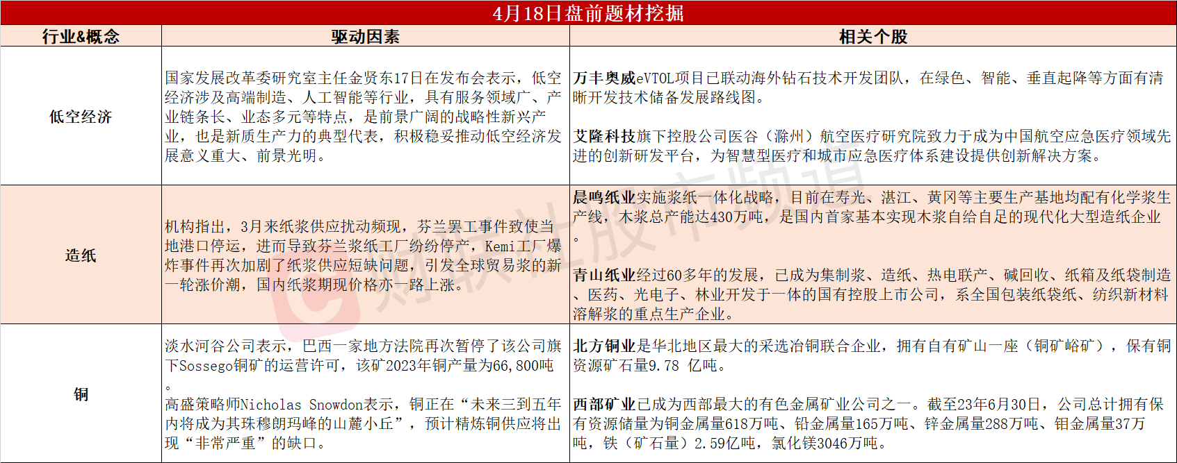 【盘前题材挖掘】①发改委称发展低空经济已具备较好基础,大空间新赛道蓄势待发。②国内纸浆期现价格一路上涨,龙头企业有望迎估值修复。③淡水河谷旗下铜矿遭关停,策略师预计精炼铜供应将严重短缺。
