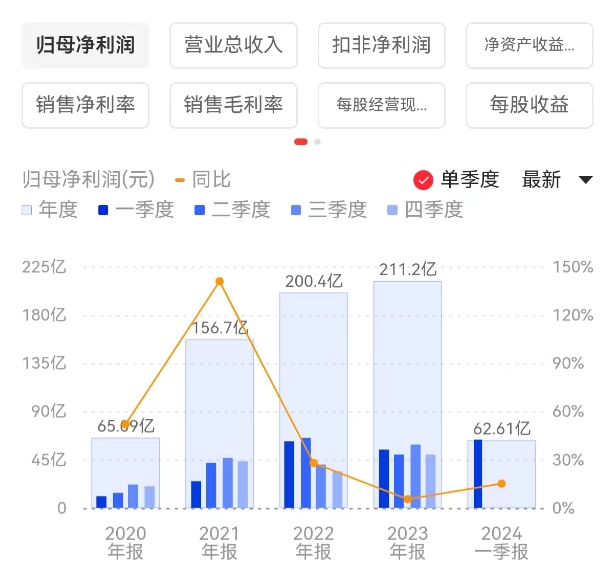 【紫金矿业:一季度净利润同比增长15.05%】财联社4月22日电,紫金矿业披露2024年第一季度报告,一季度营业收入747.77亿元,同比下降0.22%;归母净利润62.61亿元,同比增长15.05%。一季度,公司整体运营成本特别是海外项目运营成本环比下降明显,矿产金精矿和铜精矿单位销售成本环比下降幅度分别达14%和13%,叠加金铜价格持续上涨背景,公司毛利水平增厚显著。小财注:2023年Q4净利49.54亿元,据此计算,2024年Q1净利环比增长26%。