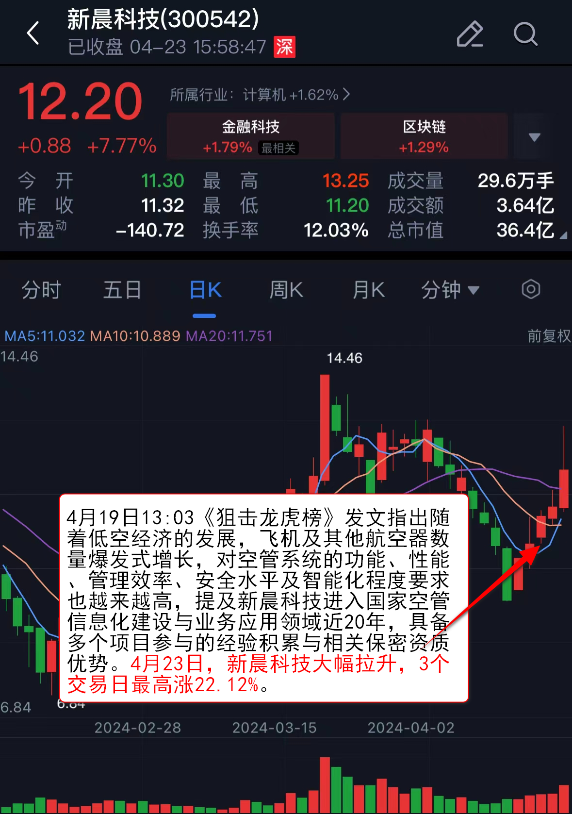 4月19日13:03《狙击龙虎榜》 发文指出随着低空经济的发展 ,飞机及其他航空器数量爆发式增长,对空管系统的功能、性能、管理效率、安全水平及智能化程度要求也越来越高,提及新晨科技进入国家空管信息化建设与业务应用领域近20年,具备多个项目参与的经验积累与相关保密资质优势。4月23日,新晨科技大幅拉升,3个交易日最高涨22.12%。