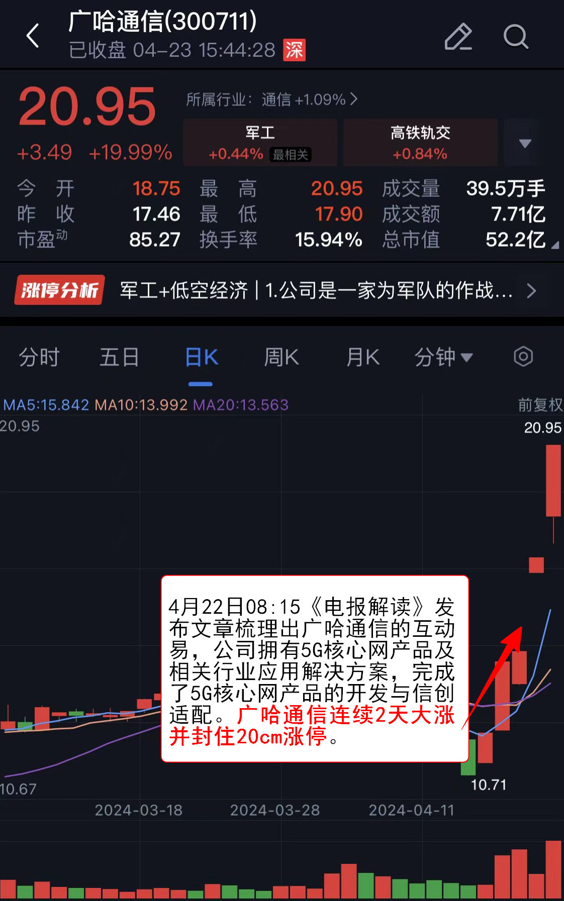 4月22日08:15《电报解读》 发布文章梳理出广哈通信的互动易 ,公司拥有5G核心网产品及相关行业应用解决方案,完成了5G核心网产品的开发与信创适配。广哈通信连续2天大涨并封住20cm涨停。