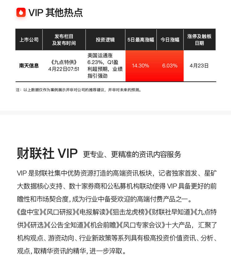注:财联社VIP为内容资讯产品,并非投资建议。以下内容仅为资讯价值展示非对相关公司的推荐建议,非未来走势预测。投资有风险,入市需谨慎。