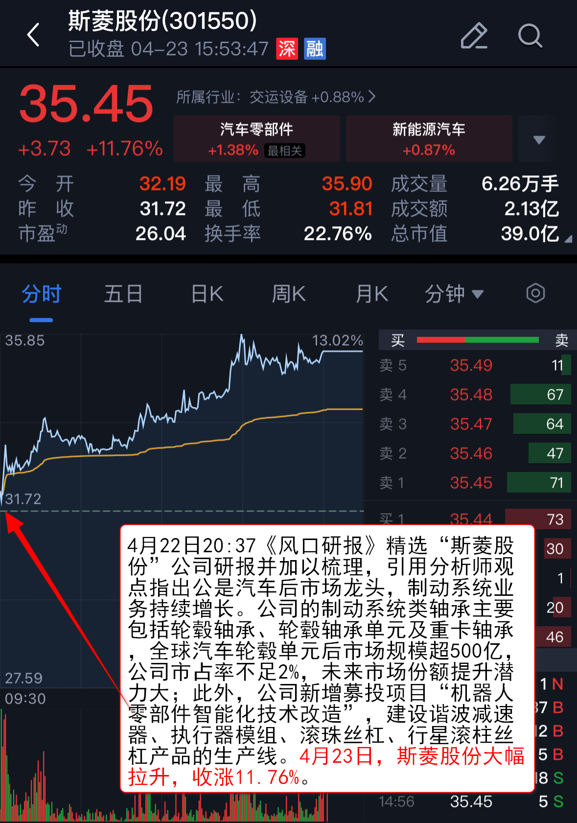 4月22日20:37《风口研报》 精选“斯菱股份”公司研报并加以梳理 ,引用分析师观点指出公是汽车后市场龙头,制动系统业务持续增长。公司的制动系统类轴承主要包括轮毂轴承、轮毂轴承单元及重卡轴承,全球汽车轮毂单元后市场规模超500亿,公司市占率不足2%,未来市场份额提升潜力大;此外,公司新增募投项目“机器人零部件智能化技术改造”,建设谐波减速器、执行器模组、滚珠丝杠、行星滚柱丝杠产品的生产线。4月23日,斯菱股份大幅拉升,收涨11.76%。