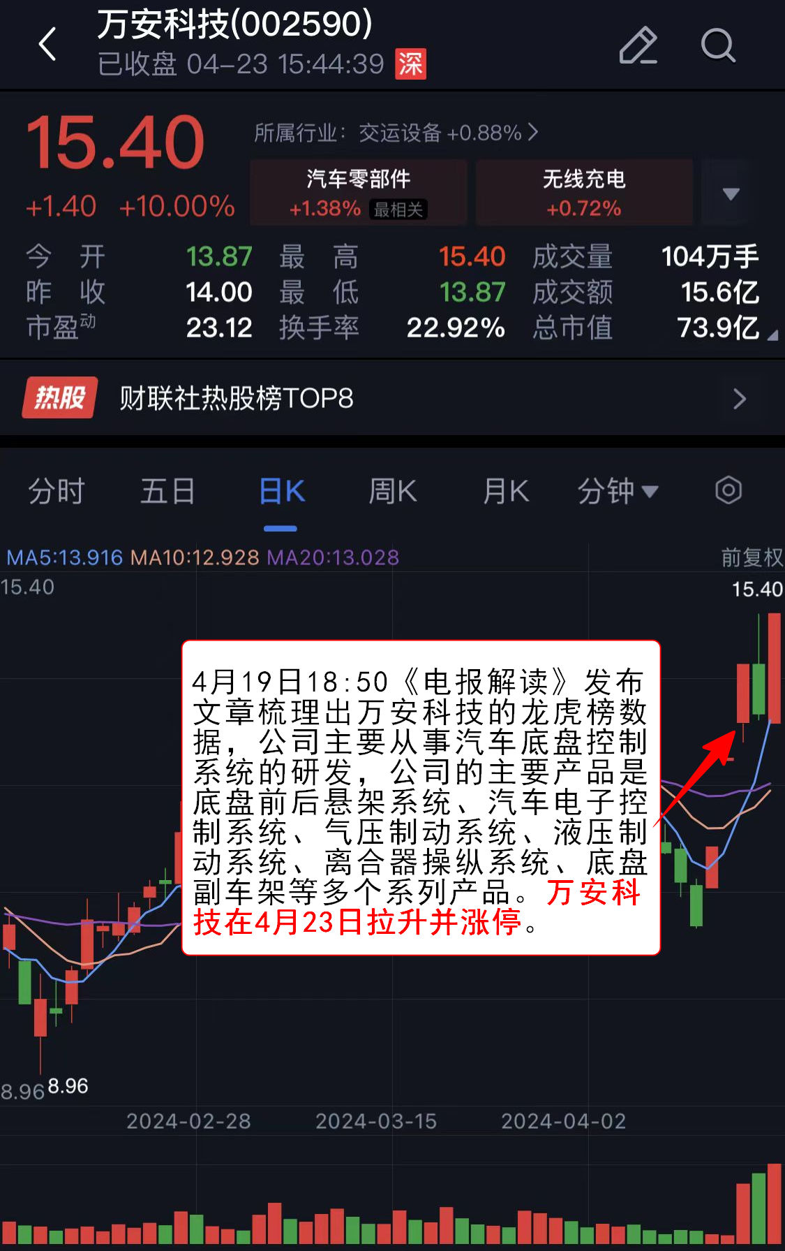 4月19日18:50《电报解读》 发布文章梳理出万安科技的龙虎榜数据 ,公司主要从事汽车底盘控制系统的研发,公司的主要产品是底盘前后悬架系统、汽车电子控制系统、气压制动系统、液压制动系统、离合器操纵系统、底盘副车架等多个系列产品。万安科技在4月23日拉升并涨停。