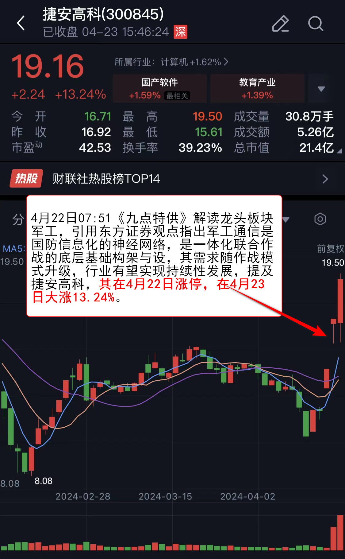 4月22日07:51《九点特供》 解读龙头板块军工 ,引用东方证券观点指出军工通信是国防信息化的神经网络,是一体化联合作战的底层基础构架与设,其需求随作战模式升级,行业有望实现持续性发展,提及捷安高科,其在4月22日涨停,在4月23日大涨13.24%。