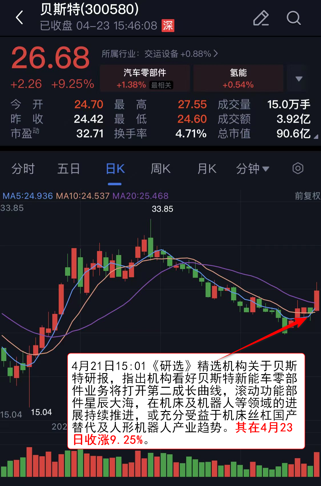 4月21日15:01《研选》 精选机构关于贝斯特研报 ,指出机构看好贝斯特新能车零部件业务将打开第二成长曲线,滚动功能部件星辰大海,在机床及机器人等领域的进展持续推进,或充分受益于机床丝杠国产替代及人形机器人产业趋势。其在4月23日收涨9.25%。