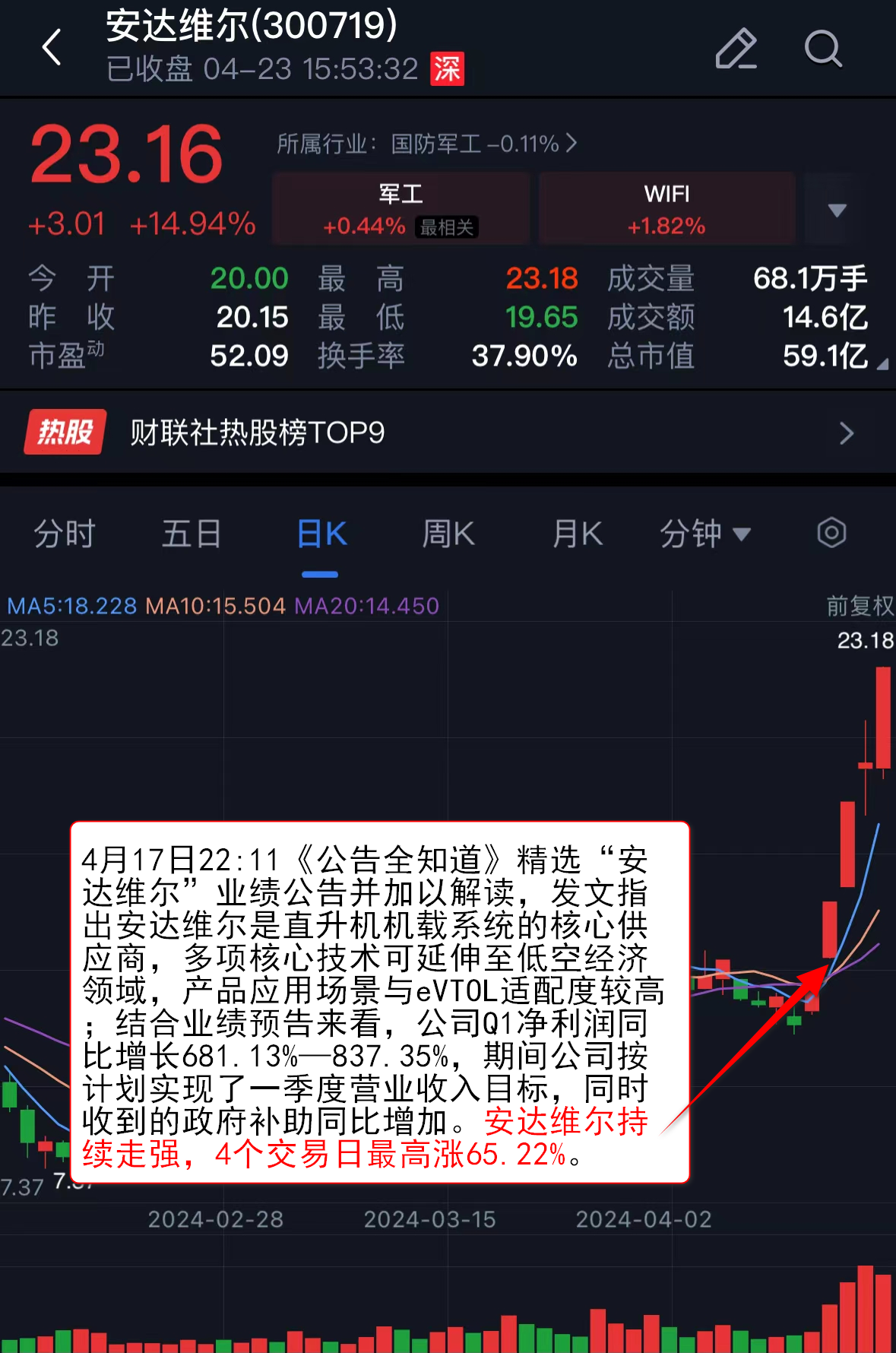 4月17日22:11《公告全知道》 精选“安达维尔”业绩公告并加以解读 ,发文指出安达维尔是直升机机载系统的核心供应商,多项核心技术可延伸至低空经济领域,产品应用场景与eVTOL适配度较高;结合业绩预告来看,公司Q1净利润同比增长681.13%—837.35%,期间公司按计划实现了一季度营业收入目标,同时收到的政府补助同比增加。安达维尔持续走强,4个交易日最高涨65.22%。