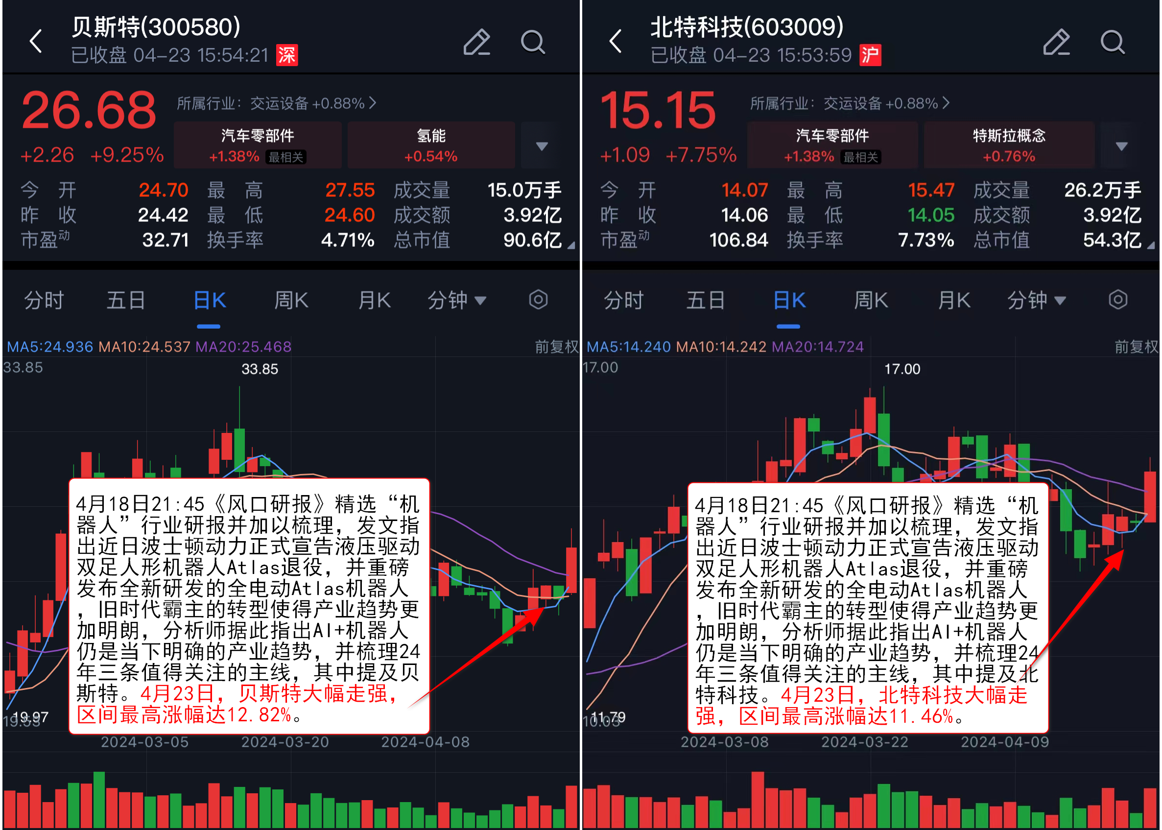 4月18日21:45《风口研报》 精选“机器人”行业研报并加以梳理 ,发文指出近日波士顿动力正式宣告液压驱动双足人形机器人Atlas退役,并重磅发布全新研发的全电动Atlas机器人,旧时代霸主的转型使得产业趋势更加明朗,分析师据此指出AI+机器人仍是当下明确的产业趋势,并梳理24年三条值得关注的主线,其中提及北特科技、贝斯特。4月23日,北特科技、贝斯特双双走强,区间最高涨幅分别达11.46%、12.82%。
