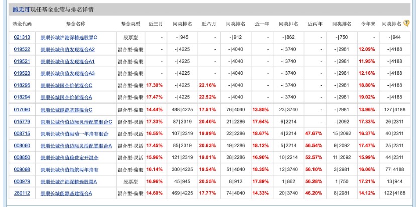 鲍无可当前管理基金为8只(只统计主基金),一季度管理规模为211.83亿元,任职最佳业绩回报率为389.51%。业绩是验金石,从他当前在管的产品来看,近两年以来的不同考核维度,所有基金回报率均为正。以今年以来收益率为例,表现最好的是景顺长城国企价值混合,为19.02%,排名最低的景顺长城价值发现也有近12%的回报率。