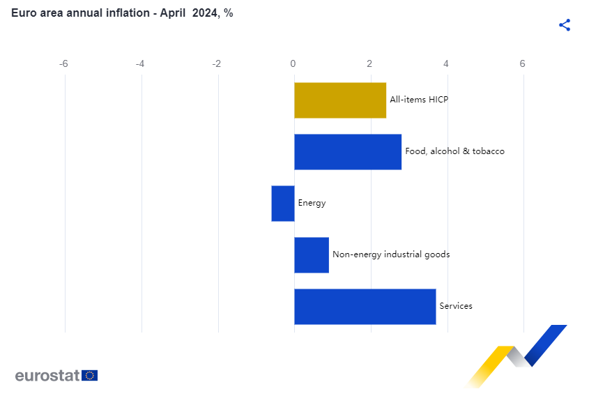 数据还显示,4月欧元区食品和烟酒价格同比上涨2.8%,较3月的2.6%反弹了0.2个百分点;非能源类工业产品价格的同比增幅从1.1%放缓至0.9%,欧洲央行重点关注的服务价格同比上涨3.7%,结束了连续第五个月保持在4%的趋势。