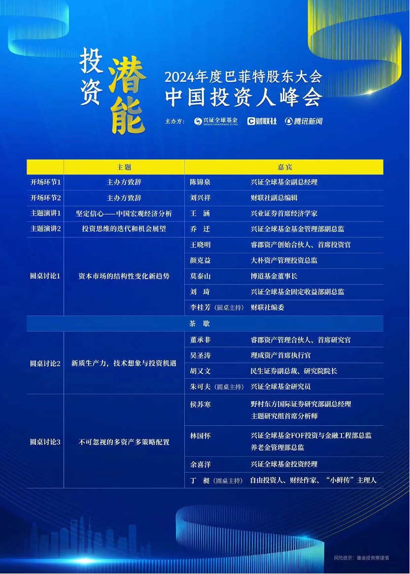 兴证全球基金联手财联社、腾讯新闻共同举办的2024年度巴菲特股东大会·中国投资人峰会,正同时迎接奥马哈时刻的到来,此次峰会将在中国上海和美国奥马哈联动举办。