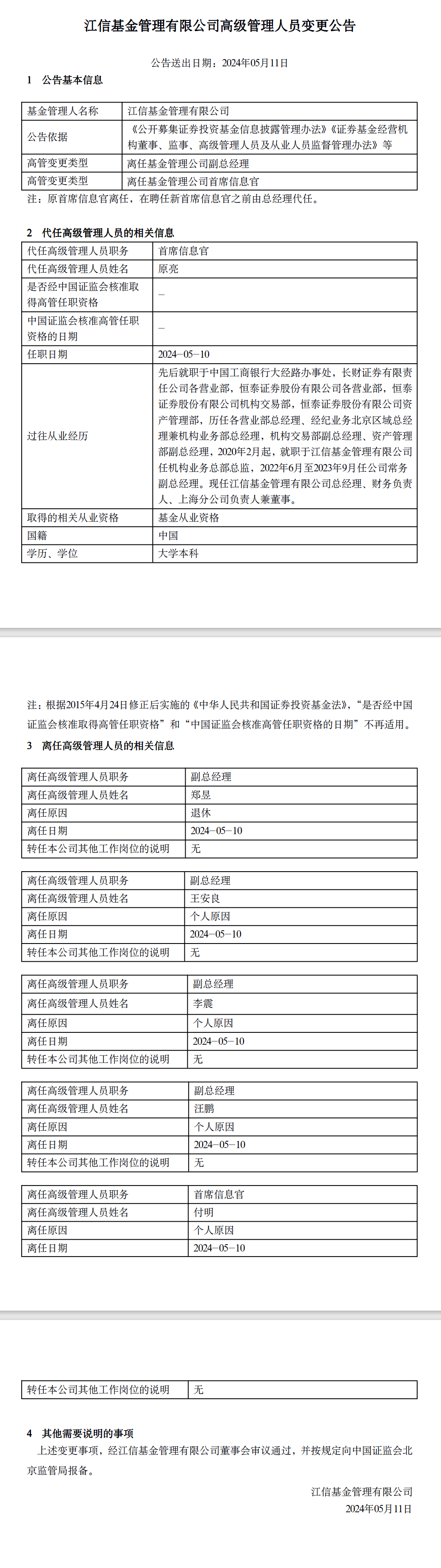 【江信基金五位高管同时离任】财联社5月11日电,江信基金管理有限公司发布高级管理人员变更公告,副总经理郑昱退休,副总经理王安良、李震、汪鹏因个人原因离任,首席信息官付明因个人原因离任。