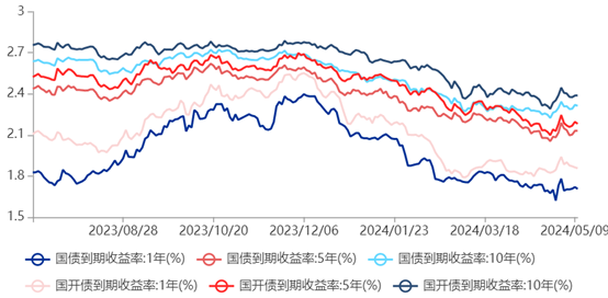 上周利率债收益率先下后上。截至5月10日收盘,1Y、5Y、10Y国债分别报收1.73%、2.12%、2.30%,分别较前一周收盘变动3BP、4BP、5BP;1Y、5Y、10Y国开债分别报收1.89%、2.18%、2.39%,分别较上周收盘变动5BP、6BP、7BP。