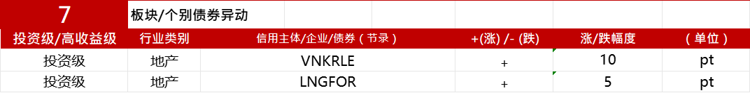 二级市场方面,中资美元债投资级市场表现较为稳健,国企板块,国家电网、中石油收窄10-11bps;科技板块,美团、小米、京东收窄1-2bps;金融板块,中金香港、交银租赁收窄1bps;投资级地产板块,万科上涨10pt,龙湖上涨5pt。中资美元债高收益市场小幅走强,新城控股、瑞安建业上涨3pt左右,绿城中国、中国金茂、金地集团上涨1-1.5pt左右。