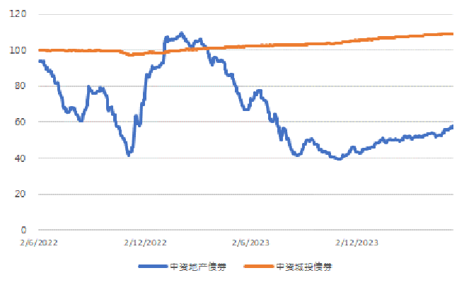 图2. 中资房地产、城投板块美元债指数走势(基准=100)
