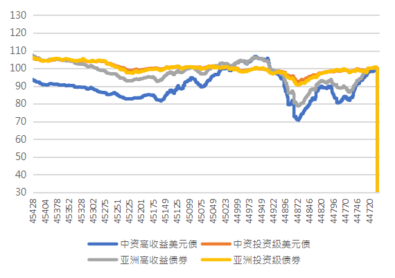 图1. 中资及亚洲美元债指数走势(基准=100)