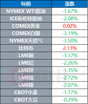 COMEX黄金期货收涨0.02%,报2364.5美元/盎司;COMEX白银期货收跌3.19%,报31.34美元/盎司。