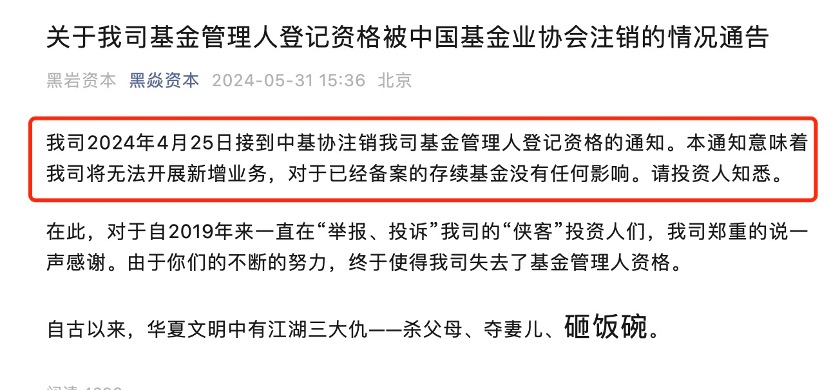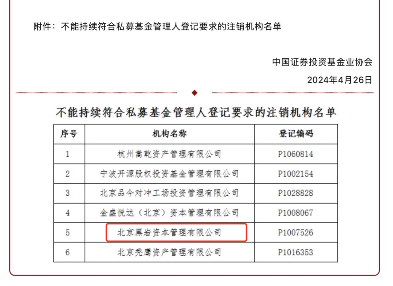 根据公告,这家叫做北京黑岩资本管理有限公司的私募,在4月25日接到中基协注销公司基金管理人登记资格的通知。