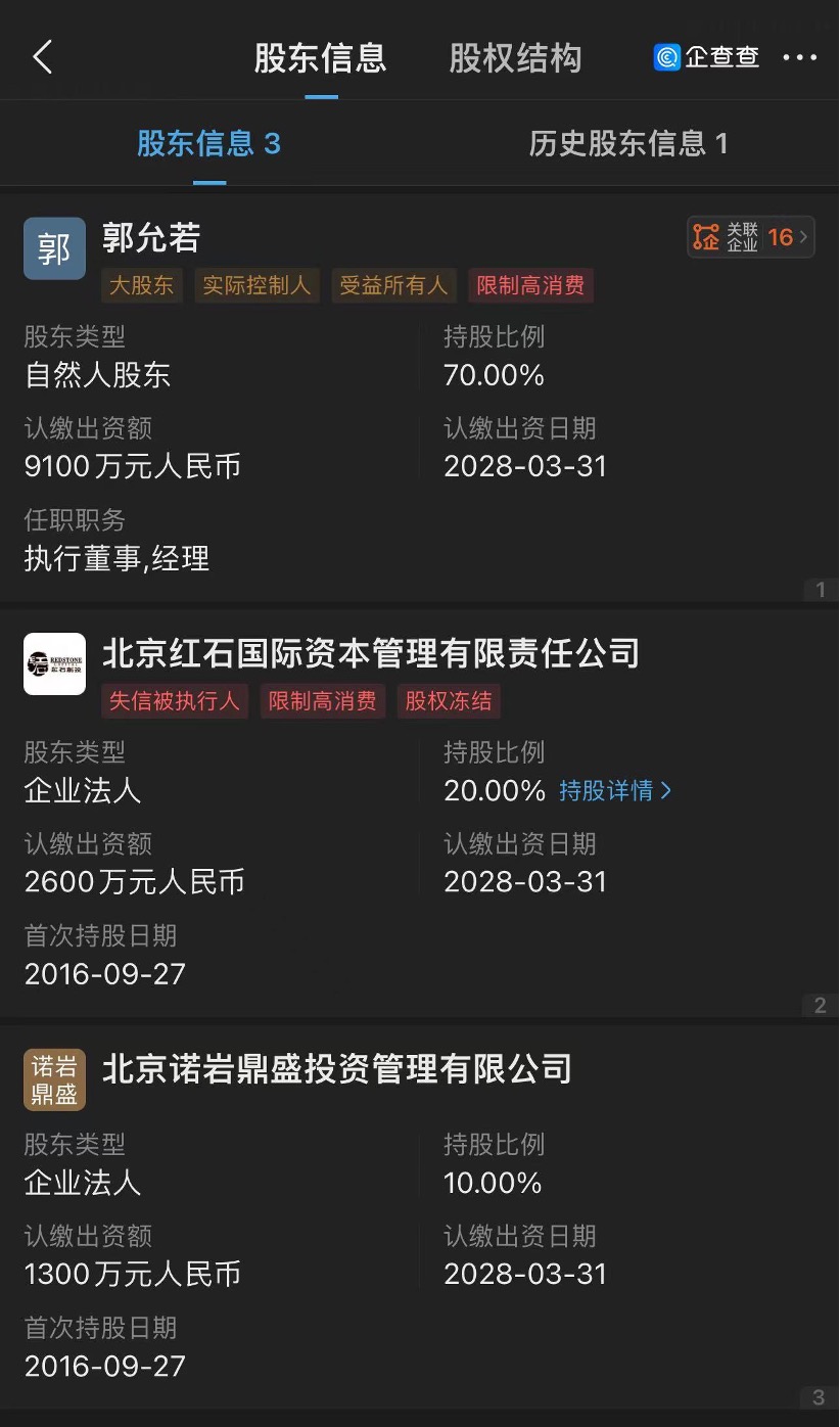 公开资料显示,黑岩资本成立于2014年,大股东为郭允若,也是公司实控人,持有股权比例为70%,北京红石国际资本管理有限责任公司为第二大股东,持股比例20%;北京诺岩鼎盛投资管理有限公司持股10%。