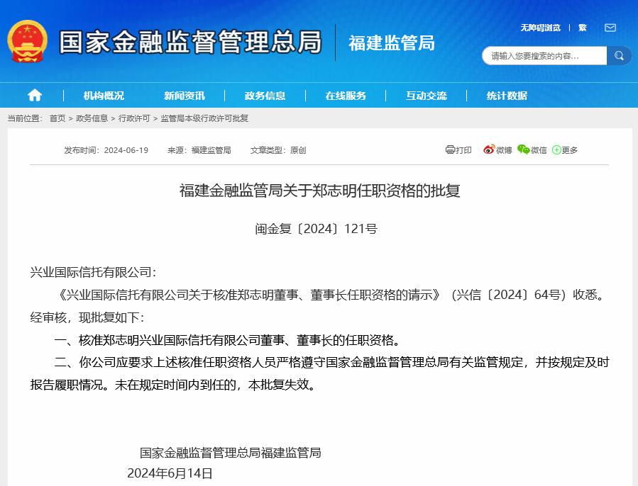 昨日,福建金融监管局发文,核准郑志明兴业国际信托有限公司董事、董事长的任职资格。其批复的时间为2024年6月14日。