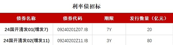 【国家开发银行将于上午09:30-10:30在上清所招标发行两期金融债 期限分别为3Y、7Y】财联社6月27日电,按照此前公布的发行计划,国开行将于上午09:30-10:30招标发行两期金融债,分别为: 24国开清发01(增发7),期限7年,发行量不超过20亿元,票面利率2.64%;24国开清发02(增发11),期限3年,发行量不超过80亿元,票面利率2%。