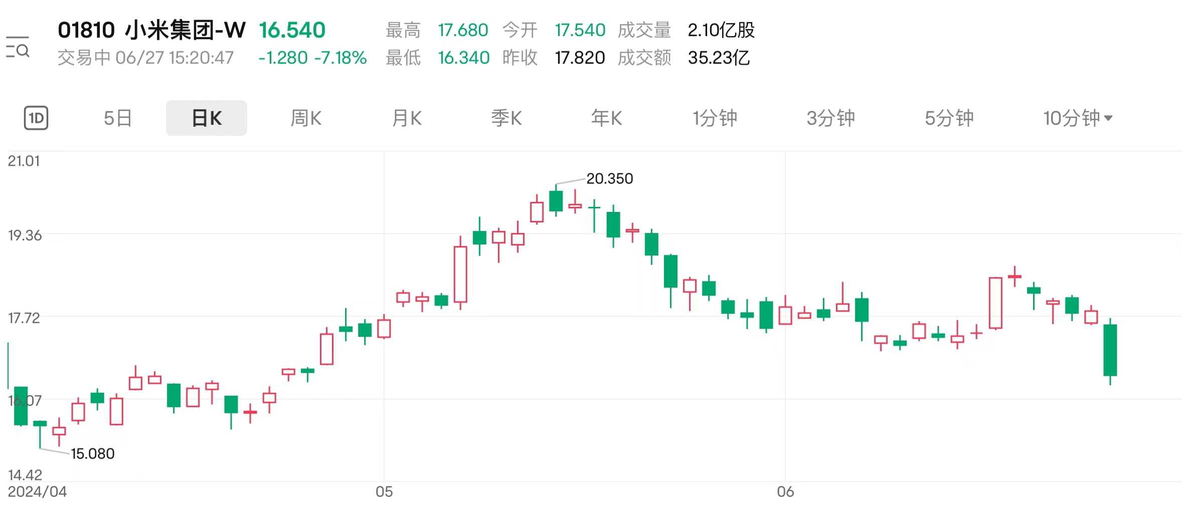财联社6月27日讯(编辑 冯轶)小米集团-W(01810.HK)今日盘中异动下挫逾8%,创近两个月以来新低。